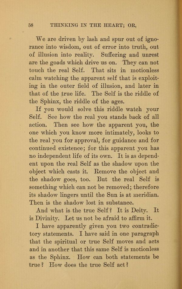 I have apparently given you two contradictory statements. I have said in one paragraph that the spiritual or true Self moves and acts and in another that this same Self is motionless as the Sphinx. How can both statements be true? How does the true Self act?