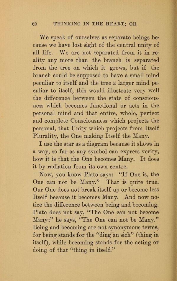 We speak of ourselves as separate beings because we have lost sight of the central unity of all life. We are not separated from it in reality any more than the branch is separated from the tree on which it grows, but if the branch could be supposed to have a small mind peculiar to itself and the tree a larger mind peculiar to itself, this would illustrate very well the difference between the state of consciousness which becomes functional or acts in the personal mind and that entire, whole, perfect and complete Consciousness which projects the personal, that Unity which projects from Itself Plurality, the One making Itself the Many.