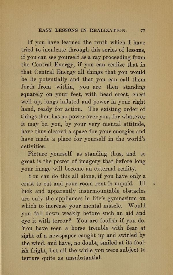If you have learned the truth which I have tried to inculcate through this series of lessons, if you can see yourself as a ray proceeding from the Central Energy, if you can realize that in that Central Energy all things that you would be lie potentially and that you can call them forth from within, you are then standing squarely on your feet, with head erect, chest well up, lungs inflated and power in your right hand, ready for action. The existing order of things then has no power over you, for whatever it may be, you, by your very mental attitude, have thus cleared a space for your energies and have made a place for yourself in the world's activities.