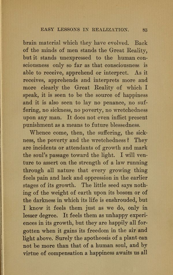 Whence come, then, the suffering, the sickness, the poverty and the wretchedness? They are incidents or attendants of growth and mark the soul's passage toward the light. I will venture to assert on the strength of a law running through all nature that every growing thing feels pain and lack and oppression in the earlier stages of its growth. The little seed says nothing of the weight of earth upon its bosom or of the darkness in which its life is enshrouded, but I know it feels them just as we do, only in lesser degree. It feels them as unhappy experiences in its growth, but they are happily all forgotten when it gains its freedom in the air and light above. Surely the apotheosis of a plant can not be more than that of a human soul, and by virtue of compensation a happiness awaits us all