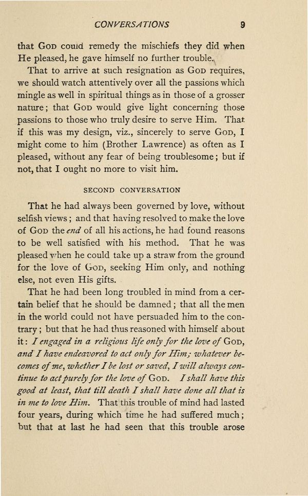 That he had been long troubled in mind from a certain belief that he should be damned; that all the men in the world could not have persuaded him to the contrary; but that he had thus reasoned with himself about it: I engaged in a religious life only for the love of GOD, and I have endeavored to act only for Hint; whatever becomes of me, whether I be lost or saved, I will always continue to act purely for the love of GOD, I shall have this good at least, that till death I shall have done all that is in me to love Him. That this trouble of mind had lasted four years, during which time he had suffered much; but that at last he had seen that this trouble arose