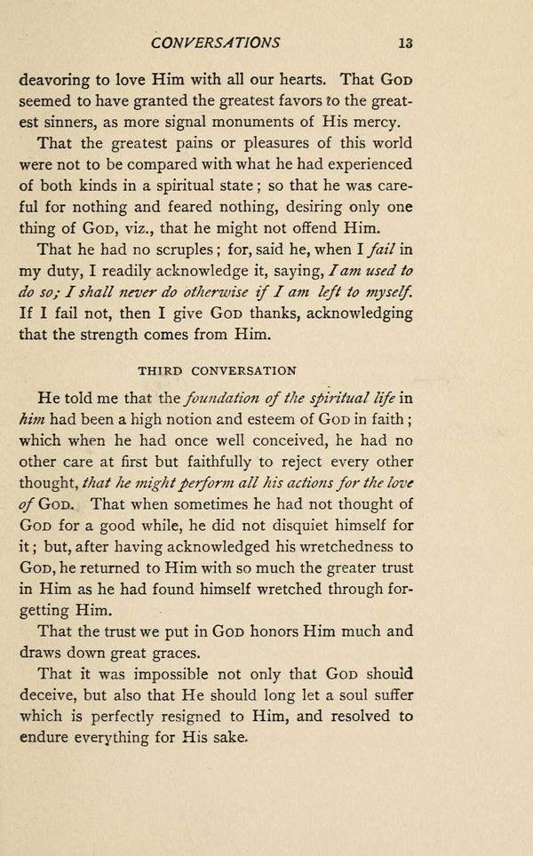 He told me that the foundation of the spiritual life in him had been a high notion and esteem of GOD in faith; which when he had once well conceived, he had no other care at first but faithfully to reject every other thought, that he might perform all his actions for the love of GOD. That when sometimes he had not thought of GOD for a good while, he did not disquiet himself for it; but, after having acknowledged his wretchedness to GOD, he returned to Him with so much the greater trust in Him as he had found himself wretched through forgetting Him.