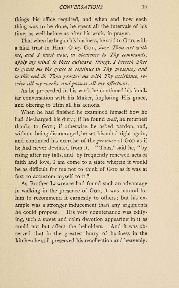 As Brother Lawrence had found such an advantage in walking in the presence of GOD, it was natural for him to recommend it earnestly to others; but his example was a stronger inducement than any arguments he could propose. His very countenance was edifying, such a sweet and calm devotion appearing in it as could not but affect the beholders. And it was observed that in the greatest hurry of business in the kitchen he still preserved his recollection and heavenly