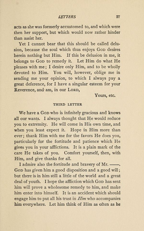 Yet I cannot bear that this should be called delusion, because the soul which thus enjoys GOD desires herein nothing but Him. If this be delusion in me, it belongs to GOD to remedy it. Let Him do what He pleases with me; I desire only Him, and to be wholly devoted to Him. You will, however, oblige me in sending me your opinion, to which I always pay a great deference, for I have a singular esteem for your Reverence, and am, in our Lord,