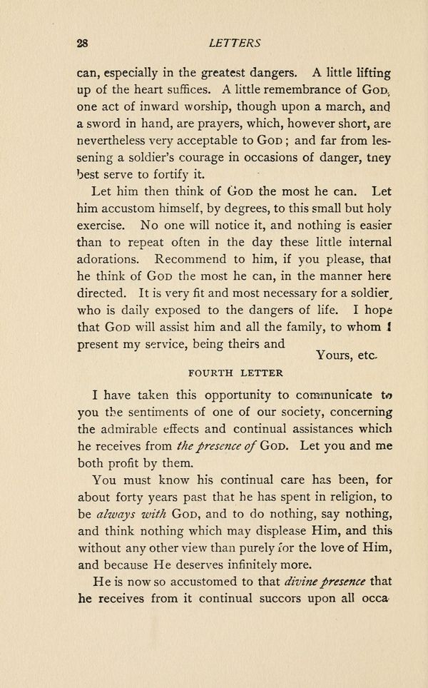 Let him then think of GOD the most he can. Let him accustom himself, by degrees, to this small but holy exercise. No one will notice it, and nothing is easier than to repeat often in the day these little internal adorations. Recommend to him, if you please, that he think of GOD the most he can, in the manner here directed. It is very fit and most necessary for a soldier, who is daily exposed to the dangers of life. I hope; that GOD will assist him and all the family, to whom i