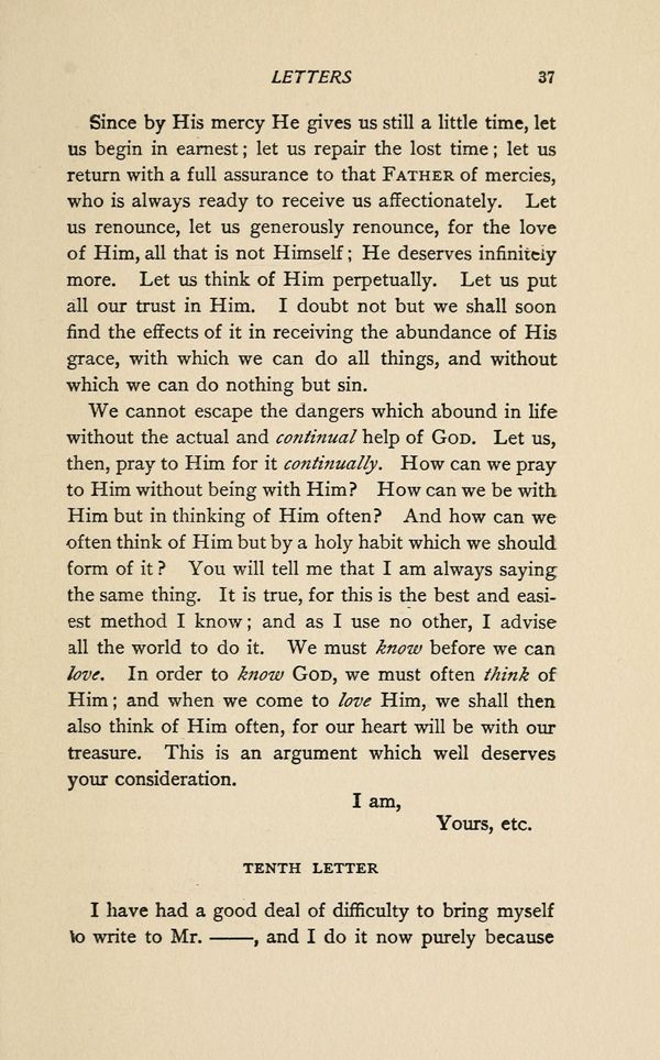 We cannot escape the dangers which abound in life without the actual and continual help of GOD. Let us, then, pray to Him for it continually. How can we pray to Him without being with Him? How can we be with Him but in thinking of Him often? And how can we often think of Him but by a holy habit which we should form of it? You will tell me that I am always saying the same thing. It is true, for this is the best and easiest method I know; and as I use no other, I advise all the world to do it. We must know before we can love. In order to know GOD, we must often think of Him; and when we come to love Him, we shall then also think of Him often, for our heart will be with our treasure. This is an argument which well deserves your consideration.