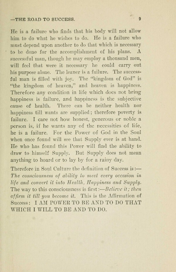 Therefore in Soul Culture the definition of Success is:The consciousness of ability to meet every occasion in life and convert it into Health, Happiness and Supply. The way to this consciousness is first:- Believe it; then affirm it till you become it. This is the Affirmation of Success: I AM POWER TO BE AND TO DO THAT WHICH I WILL TO BE AND TO DO.