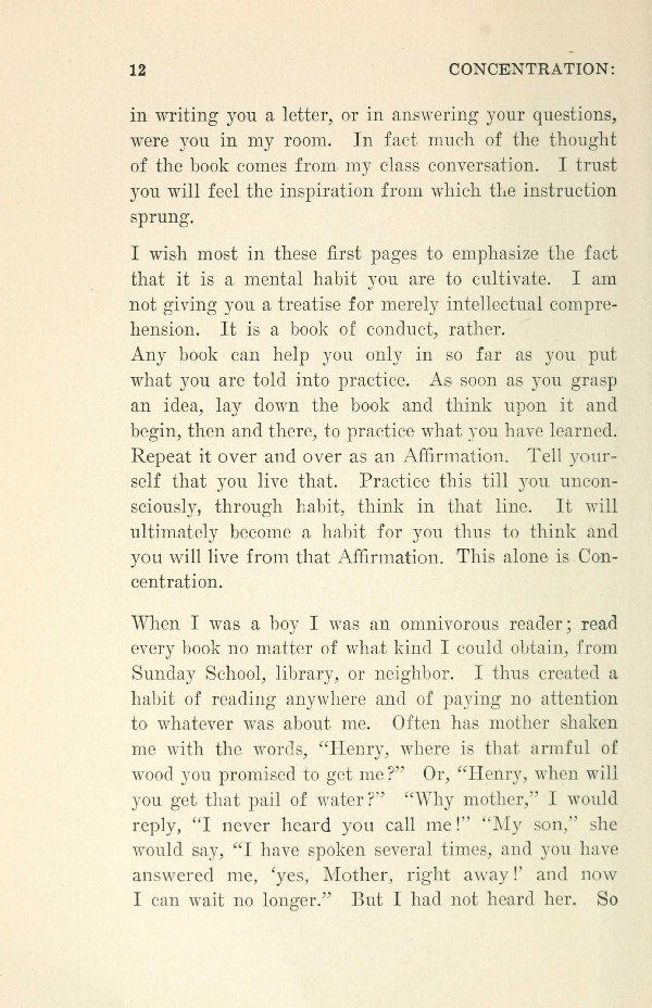 Any book can help you only in so far as you put what you are told into practice. As soon as you grasp an idea, lay down the book and think upon it and begin, then and there, to practice what you have learned. Repeat it over and over as an Affirmation. Tell yourself that you live that. Practice this till you unconsciously, through habit, think in that line. It will ultimately become a habit for you thus to think and you will live from that Affirmation. This alone is Concentration.