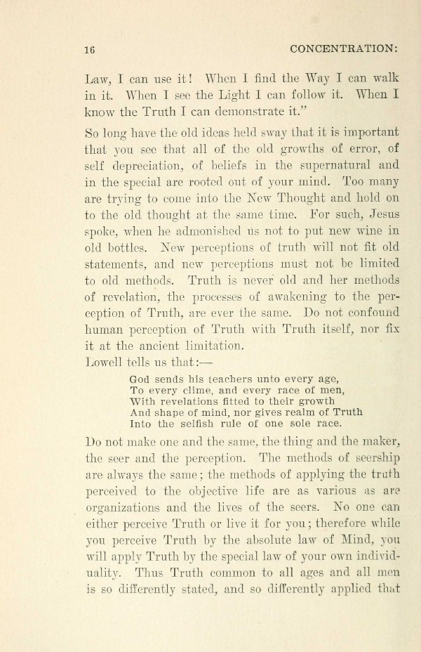 So long have the old ideas held sway that it is important that you see that all of the old growths of error, of self depreciation, of beliefs in the supernatural and in the special are rooted out of your mind. Too many are trying to come into the New Thought and hold on to the old thought at the same time. For such, Jesus spoke, when he admonished us not to put new wine in old bottles. New perceptions of truth will not fit old statements, and new perceptions must not be limited to old methods. Truth is never old and her methods of revelation, the processes of awakening to the perception of Truth, are ever the same. Do not confound human perception of Truth with Truth itself, nor fix it at the ancient limitation.