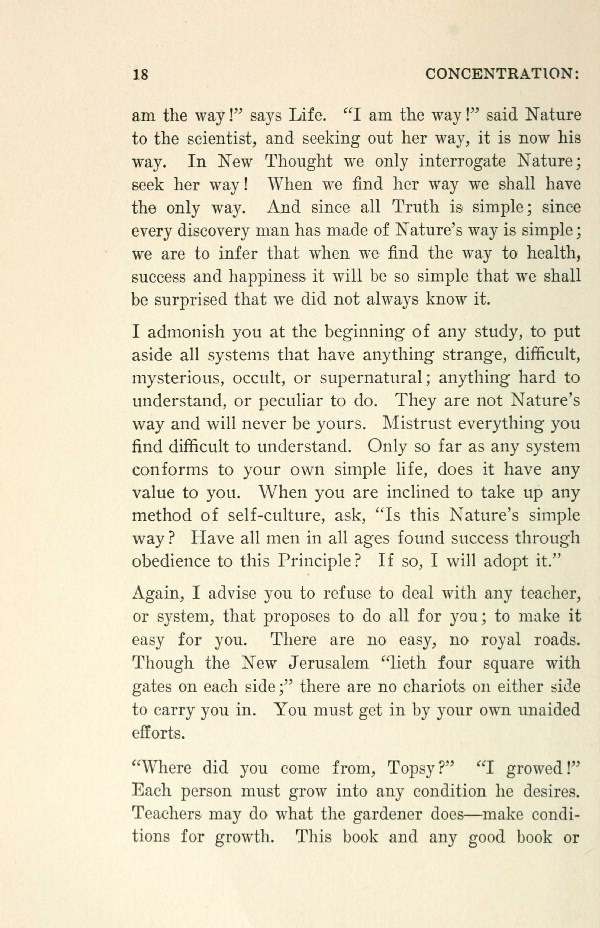 I admonish you at the beginning of any study, to put aside all systems that have anything strange, difficult, mysterious, occult, or supernatural; anything hard to understand, or peculiar to do. They are not Nature's way and will never be yours. Mistrust everything you find difficult to understand. Only so far as any system conforms to your own simple life, does it have any value to you. When you are inclined to take up any method of self-culture, ask, "Is this Nature's simple way? Have all men in all ages found success through obedience to this Principle? If so, I will adopt it."