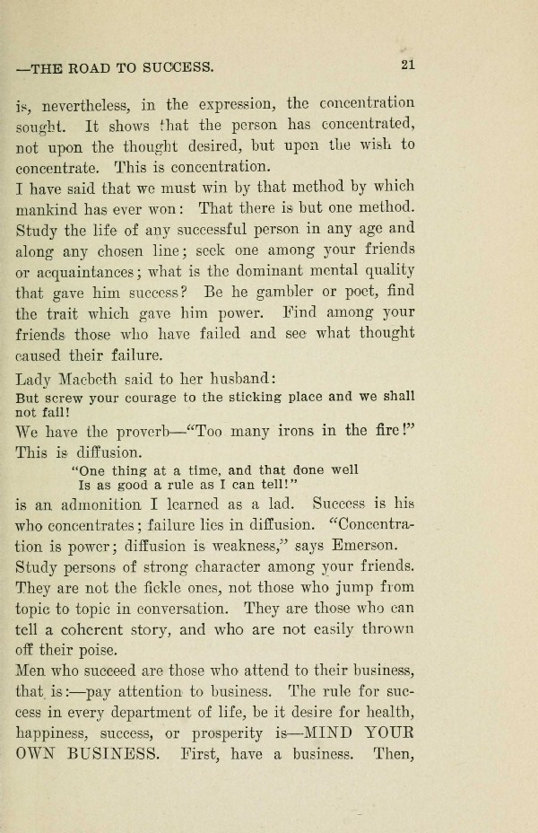 Men who succeed are those who attend to their business, that is:-pay attention to business. The rule for success in every department of life, be it desire for health, happiness, success, or prosperity is --- MIND YOUR OWN BUSINESS. First, have a business. Then,