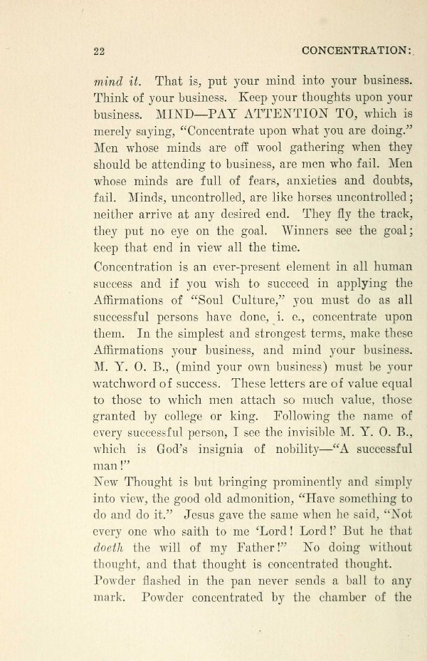 Concentration is an ever-present element in all human success and if you wish to succeed in applying the Affirmations of "Soul Culture," you must do as all successful persons have done, i. e., concentrate upon them. In the simplest and strongest terms, make these Affirmations your business, and mind your business. M. Y. 0. B., (mind your own business) must be your watchword of success. These letters are of value equal to those to which men attach so much value, those granted by college or king. Following the name of every successful person, I see the invisible M. Y. 0. B., which is God's insignia of nobility --- "A successful man!"
