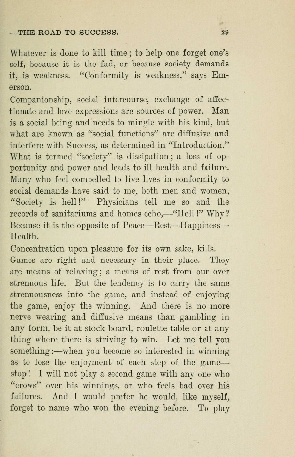Companionship, social intercourse, exchange of affectionate and love expressions are sources of power. Man is a social being and needs to mingle with his kind, but what are known as "social functions" are diffusive and interfere with Success, as determined in "Introduction." What is termed "society" is dissipation; a loss of opportunity and power and leads to ill health and failure. Many who feel compelled to live lives in conformity to social demands have said to me, both men and women, "Society is hell!" Physicians tell me so and the records of sanitariums and homes echo, --- "Hell!" Why? Because it is the opposite of Peace-Rest --- Happiness Health.