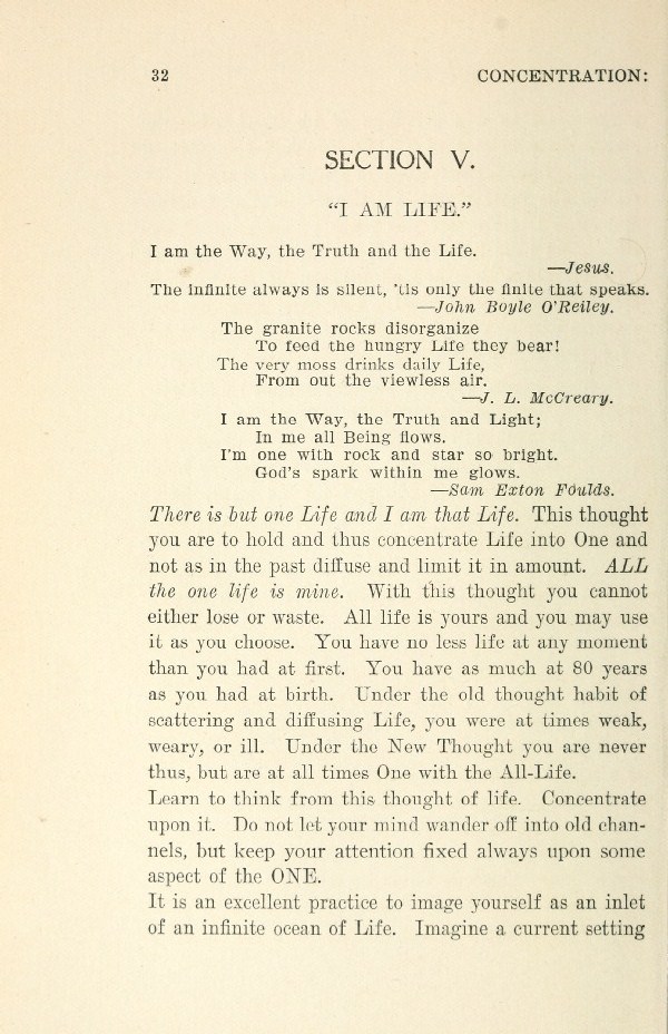 There is but one Life and I am that Life. This thought you are to hold and thus concentrate Life into One and not as in the past diffuse and limit it in amount. ALL the one life is mine. With this thought you cannot either lose or waste. All life is yours and you may use it as you choose. You have no less life at any moment than you had at first. You have as much at 80 years as you had at birth. Under the old thought habit of scattering and diffusing Life, you were at times weak, weary, or ill. Under the New Thought you are never thus, but are at all times One with the All-Life.