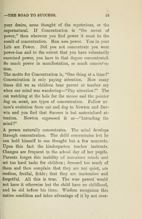 The motto for Concentration is, One thing at a time! Concentration is only paying attention. How many times did we as children hear parent or teacher say when our mind was wandering Pay attention! The cat watching at the hole for the mouse and the pointer dog on scent, are types of concentration. Follow nature's evolution from cat and dog to Newton and Darwin and you find that Success is but materialized attention. Newton expressed it as Intending the mind!