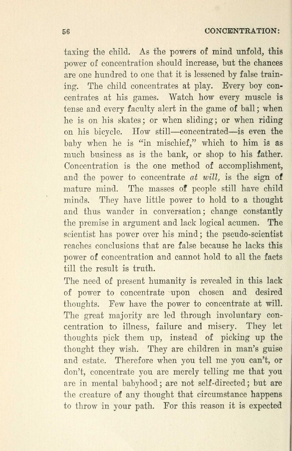 the child. As the powers of mind unfold, this power of concentration should increase, but the chances are one hundred to one that it is lessened by false training. The child concentrates at play. Every boy concentrates at his games. Watch how every muscle is tense and every faculty alert in the game of ball; when he is on his skates; or when sliding; or when riding on his bicycle. How still concentrated is even the baby when he is "in mischief," which to him is as much business as is the bank, or shop to his father. Concentration is the one method of accomplishment, and the power to concentrate at will, is the sign of mature mind. The masses of people still have child minds. They have little power to hold to a thought and thus wander in conversation; change constantly the premise in argument and lack logical acumen. The scientist has power over his mind; the pseudo-scientist reaches conclusions that are false because he lacks this power of concentration and cannot hold to all the facts till the result is truth.