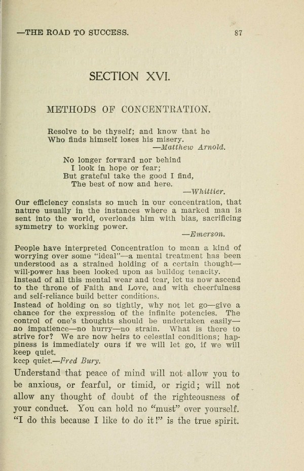 Introductory - What is Success? - The "Why" of the Book - Concentration a Natural Process - Paying Attention - Some Channels of Waste - "I Am Life" - How Shall I Concentrate - The Will - Habits - "In the Silence" - Compensation of Concentration - With Eyes See Not - The Ideal - Prayer - Desire versus Wish - Mental Poise - Methods of Concentration - Directions for Practice - How To Do It - Some Practical Suggestions - Self-Study and the Law of Life - Special Desires versus Principles - My One Rule:-Agreement - Love - Opinions and Methods of Others - A Parting Word -
