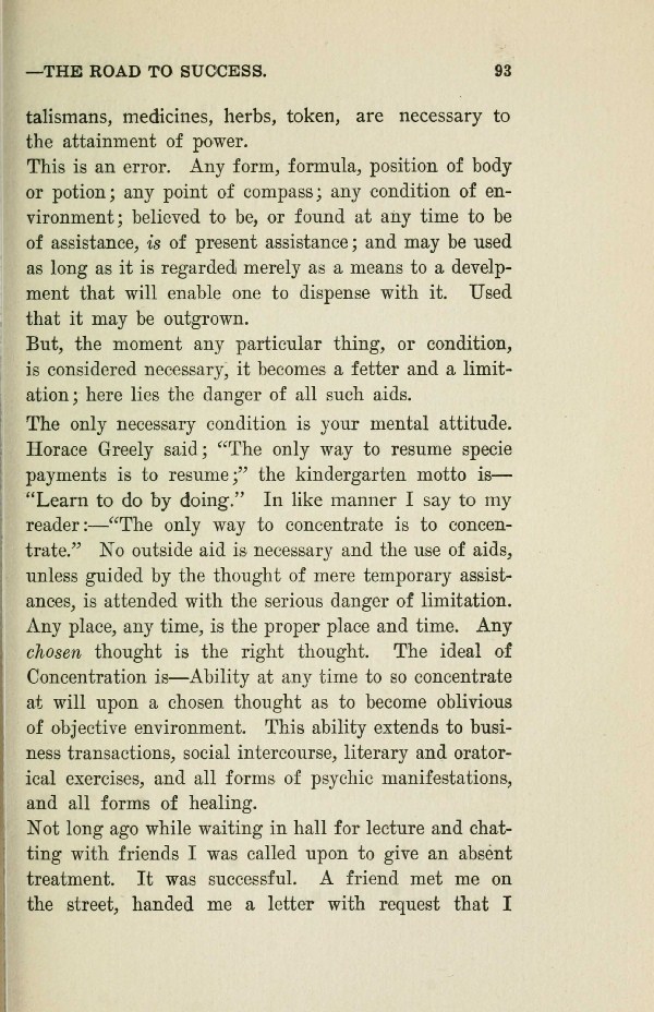 The only necessary condition is your mental attitude. Horace Greely said; "The only way to resume specie payments is to resume;" the kindergarten motto is, "Learn to do by doing." In like manner I say to my reader: "The only way to concentrate is to concentrate." No outside aid is necessary and the use of aids, unless guided by the thought of mere temporary assistance's, is attended with the serious danger of limitation. Any place, any time, is the proper place and time. Any chosen thought is the right thought. The ideal of Concentration is Ability at any time to so concentrate at will upon a chosen thought as to become oblivious of objective environment. This ability extends to business transactions, social intercourse, literary and oratorical exercises, and all forms of psychic manifestations, and all forms of healing.