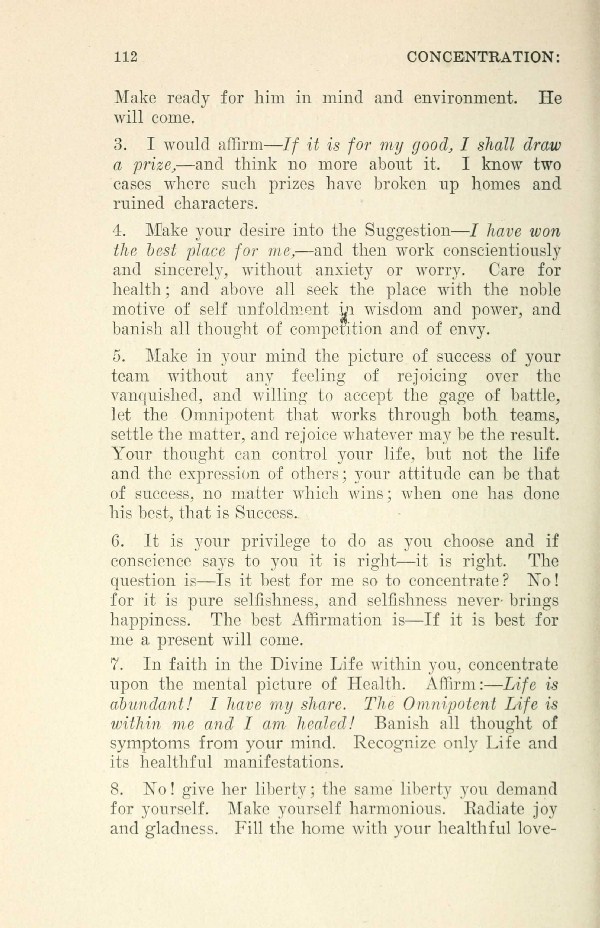 6. It is your privilege to do as you choose and if conscience says to you it is right-it is right. The question is --- Is it best for me so to concentrate? No! for it is pure selfishness, and selfishness never --- brings happiness. The best Affirmation is --- If it is best for me a present will come.