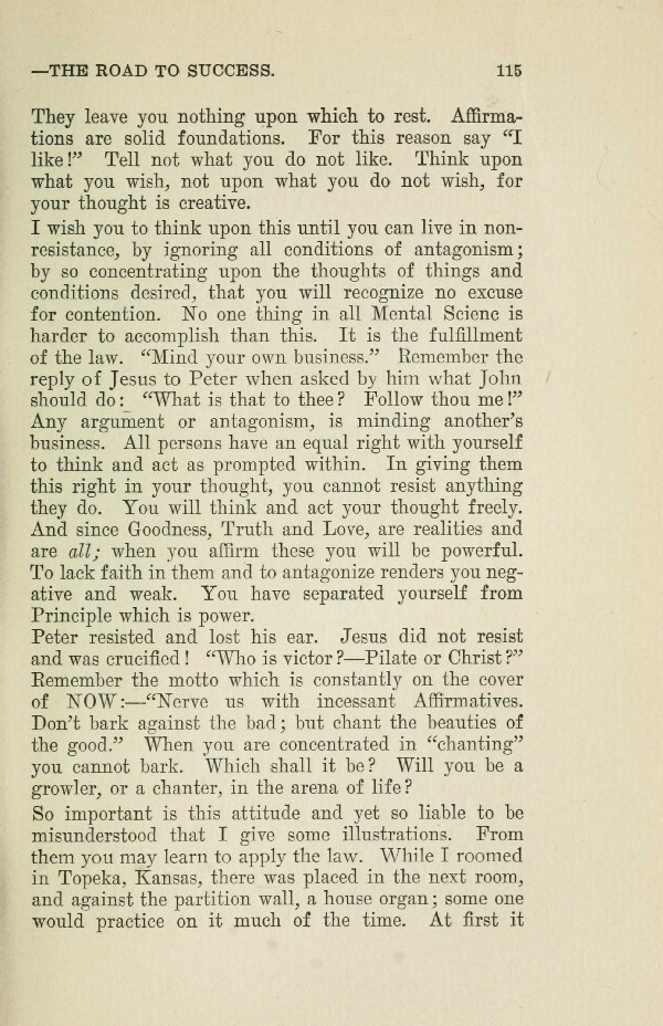 I wish you to think upon this until you can live in nonresistance, by ignoring all conditions of antagonism; by so concentrating upon the thoughts of things and conditions desired, that you will recognize no excuse for contention. No one thing in all Mental Science is harder to accomplish than this. It is the fulfillment of the law. Mind your own business. Remember the reply of Jesus to Peter when asked by him what John should do "What is that to thee? Follow thou me!" Any argument or antagonism, is minding another's business. All persons have an equal right with yourself to think and act as prompted within. In giving them this right in your thought, you cannot resist anything they do. You will think and act your thought freely. And since Goodness, Truth and Love, are realities and are all; when you affirm these you will be powerful. To lack faith in them and to antagonize renders you negative and weak. You have separated yourself from Principle which is power.