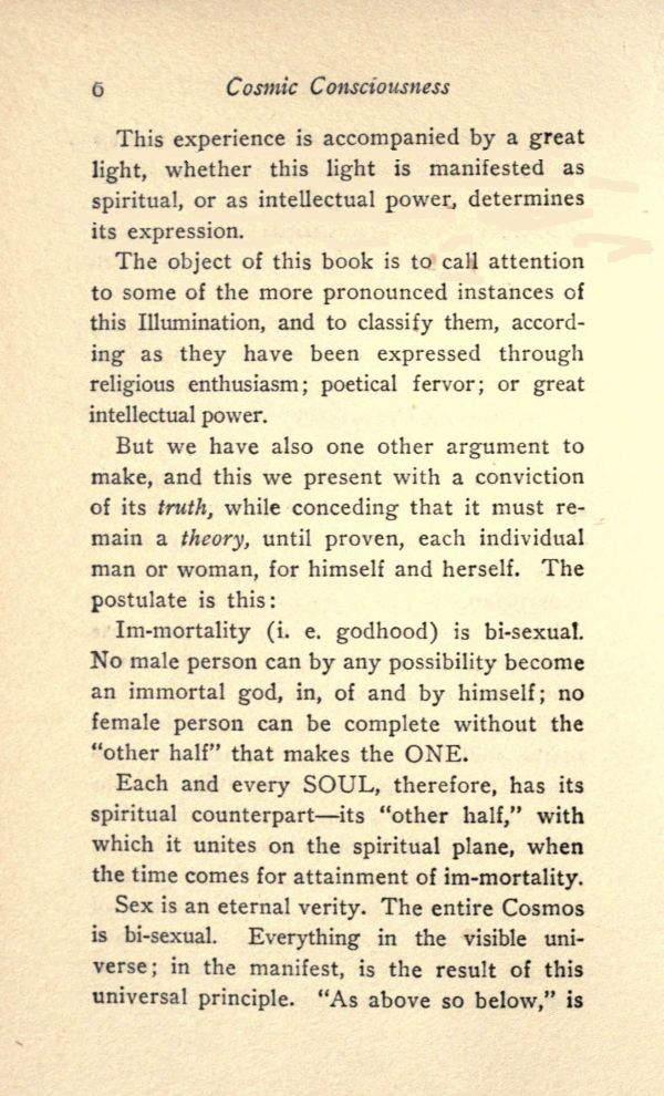 But we have also one other argument to make, and this we present with a conviction of its truth, while conceding that it must remain a theory, until proven, each individual, man or woman, for himself and herself. The postulate is this: immortality (i.e. godhood) is bi-sexual. No male person can by any possibility become an immortal god, in, of and by himself; no female person can be complete without the "other half" that makes the ONE.