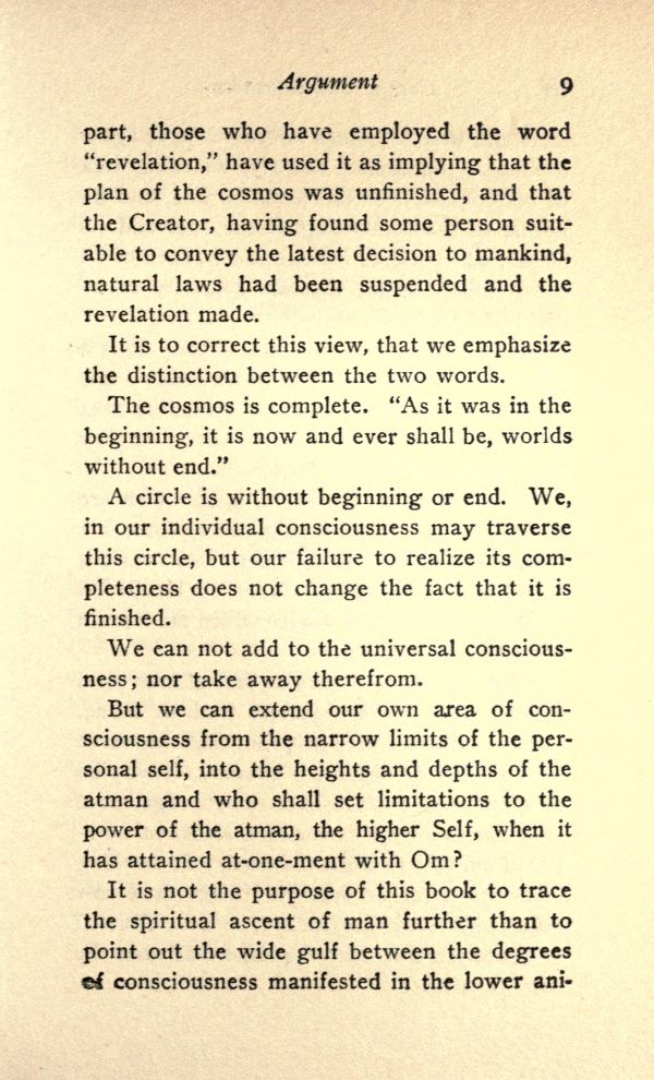 It is not the purpose of this book to trace the spiritual ascent of man further than to point out the wide gulf between the degrees of consciousness manifested in the lower animals