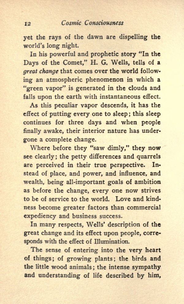 In his powerful and prophetic story "In the Days of the Comet," H.G. Wells, tells of a great change that comes over the world following an atmospheric phenomenon in which a "green vapor" is generated in the clouds and falls upon the earth with instantaneous effect.