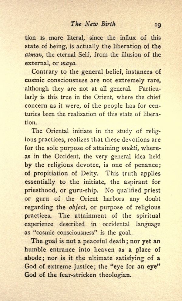 The Oriental initiate in the study of religious practices, realizes that these devotions are for the sole purpose of attaining mukti, whereas in the Occident, the very general idea held by the religious devotee, is one of penance; of propitiation of Deity. This truth applies essentially to the initiate, the aspirant for priesthood, or guru-ship. No qualified priest or guru of the Orient harbors any doubt regarding the object, or purpose of religious practices. The attainment of the spiritual experience described in occidental language as "cosmic consciousness" is the goal.