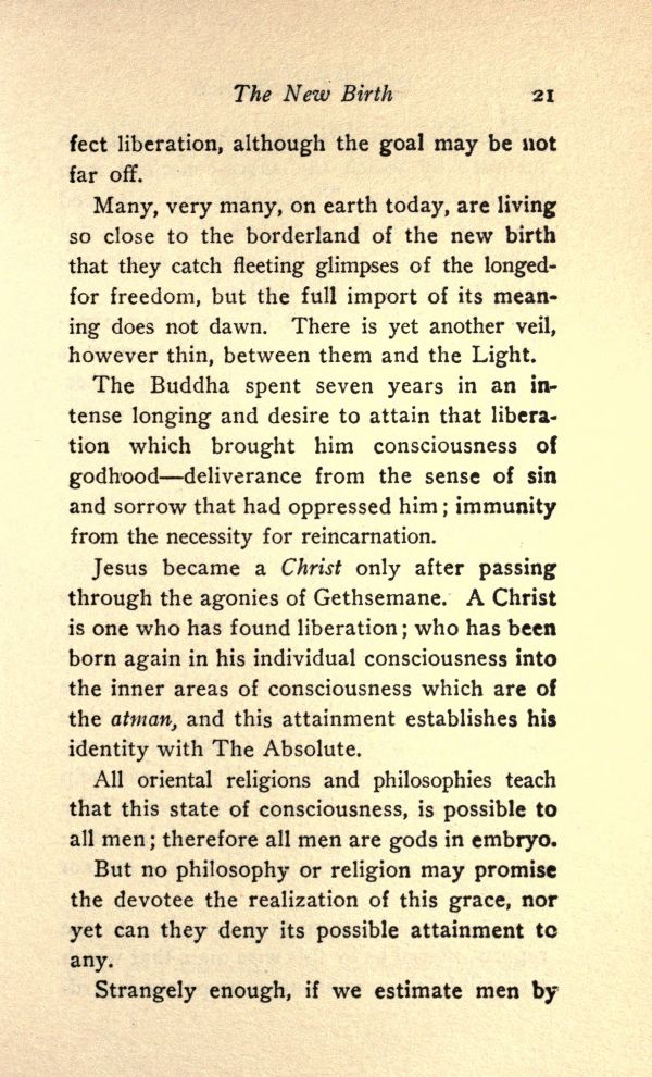 Jesus became a Christ only after passing through the agonies of Gethsemane. A Christ is one who has found liberation; who has been born again in his individual consciousness into the inner areas of consciousness which are of the atman, and this attainment establishes his identity with The Absolute.