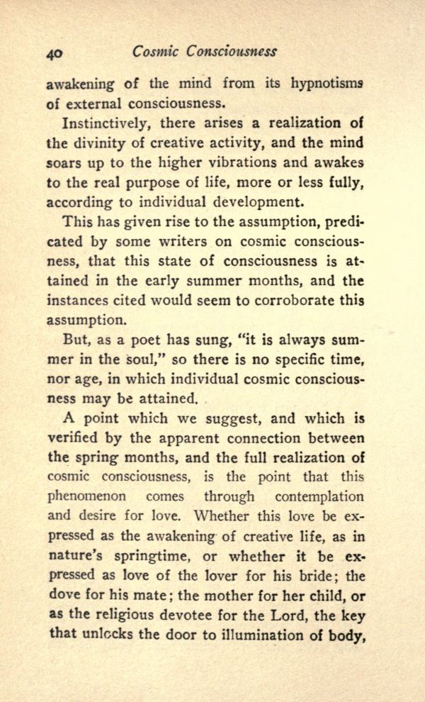 But, as a poet has sung, "it is always summer in the soul," so there is no specific time, nor age, in which individual cosmic consciousness may be attained.