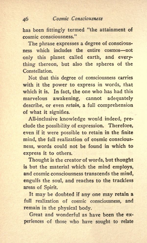 Not that this degree of consciousness carries with it the power to express in words, that which it is. In fact, the one who has had this marvelous awakening, cannot adequately describe, or even retain, a full comprehension of what it signifies.