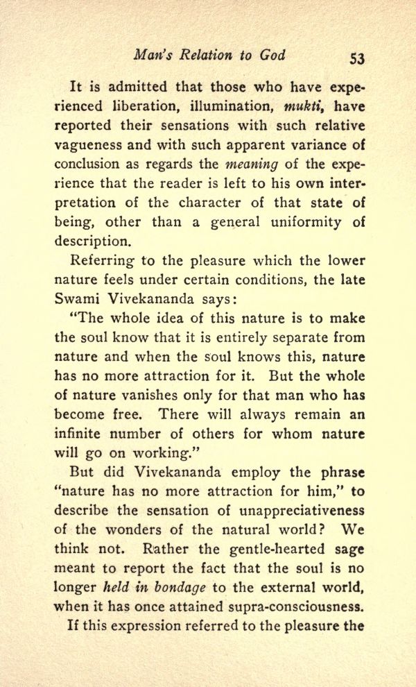 But did Vivekananda employ the phrase "nature has no more attraction for him," to describe the sensation of unappreciativeness of the wonders of the natural world? We think not. Rather the gentle-hearted sage meant to report the fact that the soul is no longer held in bondage to the external world, when it has once attained supra-consciousness.