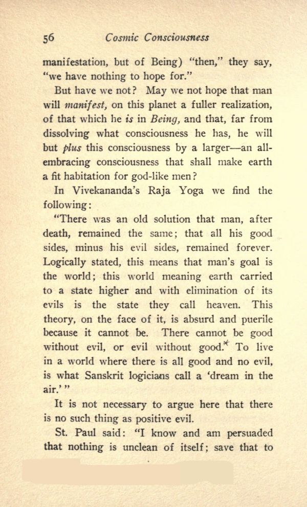 "There was an old solution that man, after death, remained the same; that all his good sides, minus his evil sides, remained forever. Logically stated, this means that man's goal is the world; this world meaning earth carried to a state higher and with elimination of its evils is the state they call heaven. This theory, on the face of it, is absurd and puerile because it cannot be. There cannot be good without evil, or evil without good. To live in a world where there is all good and no evil, is what Sanskrit logicians call a 'dream in the air.'"