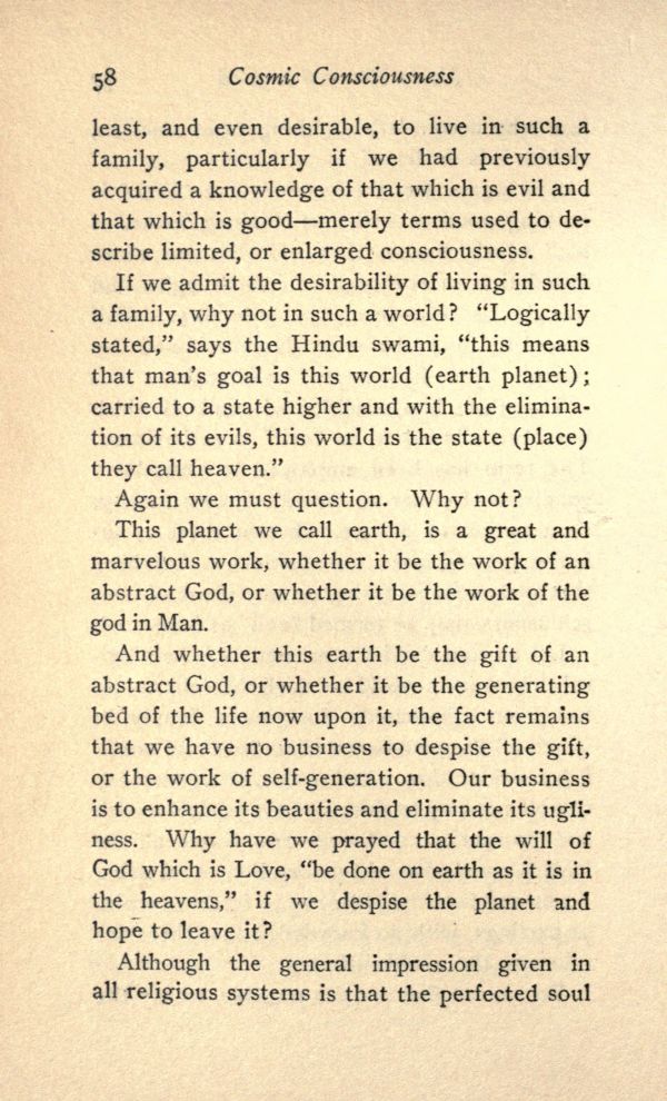 If we admit the desirability of living in such a family, why not in such a world? "Logically stated," says the Hindu swami, "this means that man's goal is this world (earth planet); carried to a state higher and with the elimination of its evils, this world is the state (place) they call heaven."