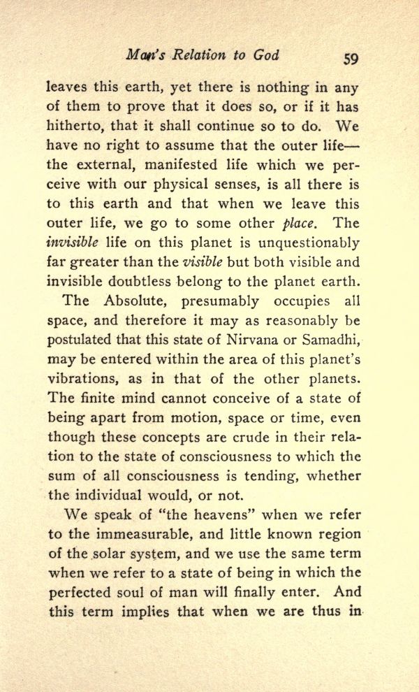 The Absolute, presumably occupies all space, and therefore it may as reasonably be postulated that this state of Nirvana or Samadhi, may be entered within the area of this planet's vibrations, as in that of the other planets. The finite mind cannot conceive of a state of being apart from motion, space or time, even though these concepts are crude in their relation to the state of consciousness to which the sum of all consciousness is tending, whether the individual would, or not.