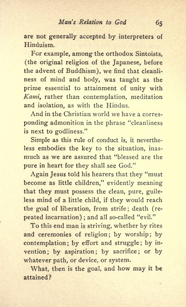 For example, among the orthodox Sintoists, (the original religion of the Japanese, before the advent of Buddhism), we find that cleanliness of mind and body, was taught as the prime essential to attainment of unity with Kami, rather than contemplation, meditation and isolation, as with the Hindus.