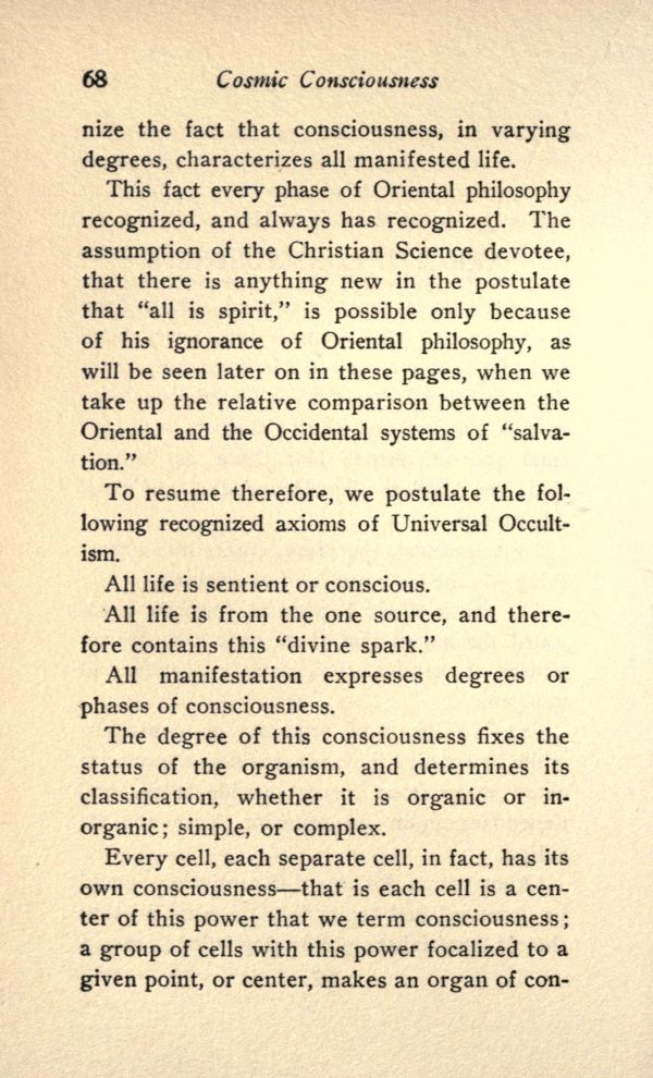This fact every phase of Oriental philosophy recognized, and always has recognized. The assumption of the Christian Science devotee, that there is anything new in the postulate that "all is spirit," is possible only because of his ignorance of Oriental philosophy, as will be seen later on in these pages, when we take up the relative comparison between the Oriental and the Occidental systems of "salvation."
