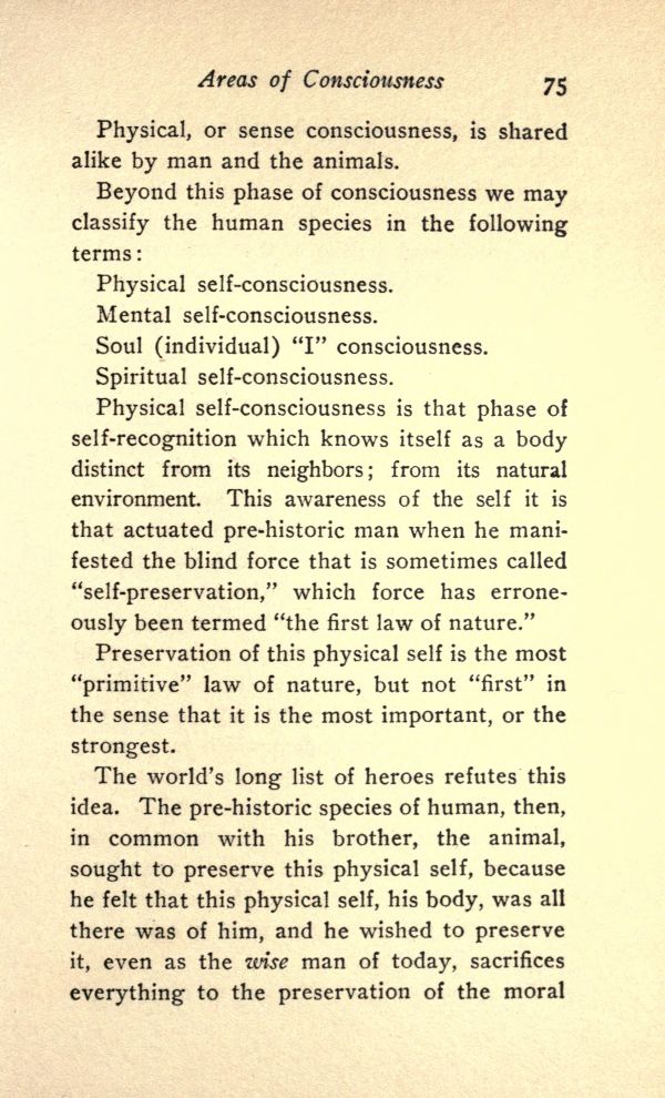 Physical self-consciousness is that phase of self-recognition which knows itself as a body distinct from its neighbors; from its natural environment. This awareness of the self it is that actuated pre-historic man when he manifested the blind force that is sometimes called "self-preservation," which force has erroneously been termed "the first law of nature."