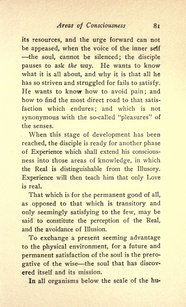 its resources, and the urge forward can not be appeased, when the voice of the inner self--the soul, cannot be silenced; the disciple pauses to ask the way. He wants to know what it is all about, and why it is that all he has so striven and struggled for fails to satisfy. He wants to know how to avoid pain; and how to find the most direct road to that satisfaction which endures; and which is not synonymous with the so-called "pleasures" of the senses.