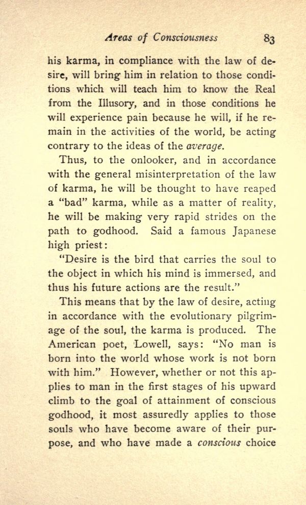 This means that by the law of desire, acting in accordance with the evolutionary pilgrimage of the soul, the karma is produced. The American poet, Lowell, says: "No man is born into the world whose work is not born with him." However, whether or not this applies to man in the first stages of his upward climb to the goal of attainment of conscious godhood, it most assuredly applies to those souls who have become aware of their purpose, and who have made a conscious choice