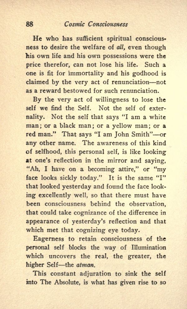 By the very act of willingness to lose the self we find the Self. Not the self of externality. Not the self that says "I am a white man; or a black man; or a yellow man; or a red man." That says "I am John Smith"--or any other name. The awareness of this kind of selfhood, this personal self, is like looking at one's reflection in the mirror and saying, "Ah, I have on a becoming attire," or "my face looks sickly to-day." It is the same "I" that looked yesterday and found the face looking excellently well, so that there must have been consciousness behind the observation, that could take cognizance of the difference in appearance of yesterday's reflection and that which met that cognizing eye to-day.