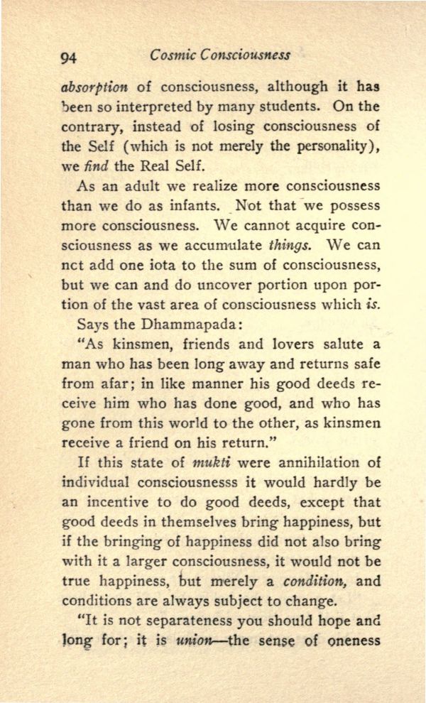 absorption of consciousness, although it has been so interpreted by many students. On the contrary, instead of losing consciousness of the Self (which is not merely the personality), we find the Real Self.