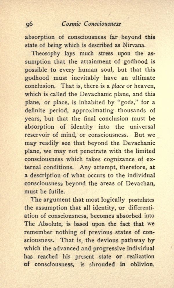 Theosophy lays much stress upon the assumption that the attainment of godhood is possible to every human soul, but that this godhood must inevitably have an ultimate conclusion. That is, there is a place or heaven, which is called the Devachanic plane, and this plane, or place, is inhabited by "gods," for a definite period, approximating thousands of years, but that the final conclusion must be, absorption of identity into the universal reservoir of mind, or consciousness. But we may readily see that beyond the Devachanic plane, we may not penetrate with the limited consciousness which takes cognizance of external conditions. Any attempt, therefore, at a description of what occurs to the individual consciousness beyond the areas of Devachan, must be futile.