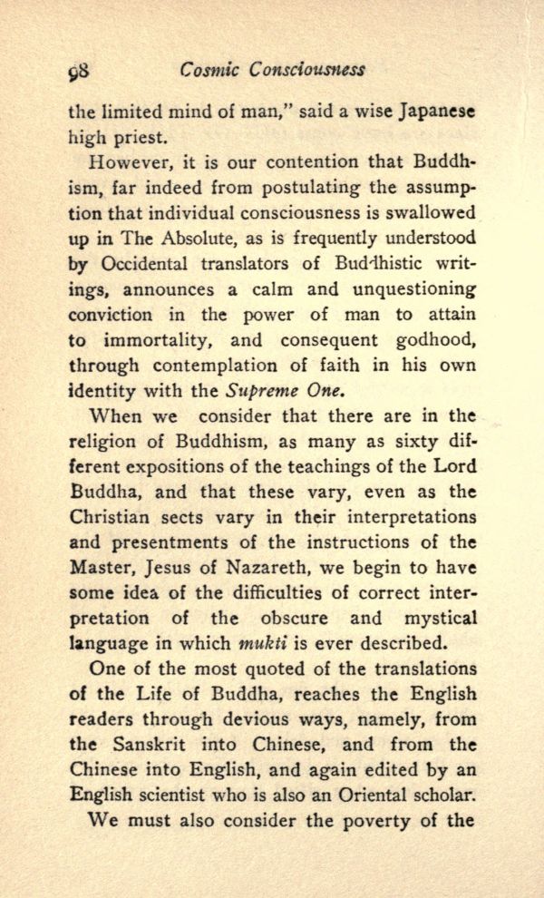 However, it is our contention that Buddhism, far indeed from postulating the assumption that individual consciousness is swallowed up in The Absolute, as is frequently understood by Occidental translators of Buddhistic writings, announces a calm and unquestioning conviction in the power of man to attain to immortality, and consequent godhood, through contemplation of faith in his own identity with the Supreme One.