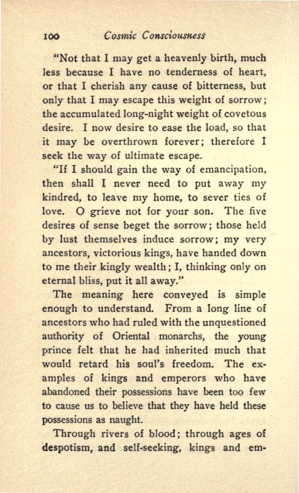 The meaning here conveyed is simple enough to understand. From a long line of ancestors who had ruled with the unquestioned authority of Oriental monarchs, the young prince felt that he had inherited much that would retard his soul's freedom. The examples of kings and emperors who have abandoned their possessions have been too few to cause us to believe that they have held these possessions as naught.