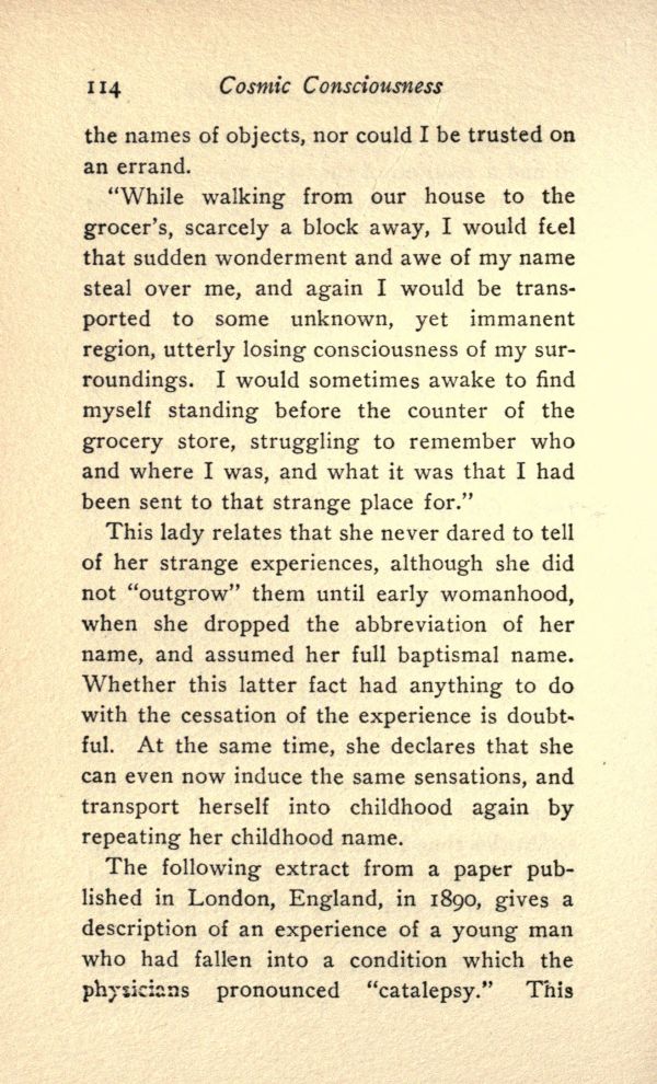 "While walking from our house to the grocer's, scarcely a block away, I would feel that sudden wonderment and awe of my name steal over me, and again I would be transported to some unknown, yet immanent region, utterly losing consciousness of my surroundings. I would sometimes awake to find myself standing before the counter of the grocery store, struggling to remember who and where I was, and what it was that I had been sent to that strange place for."