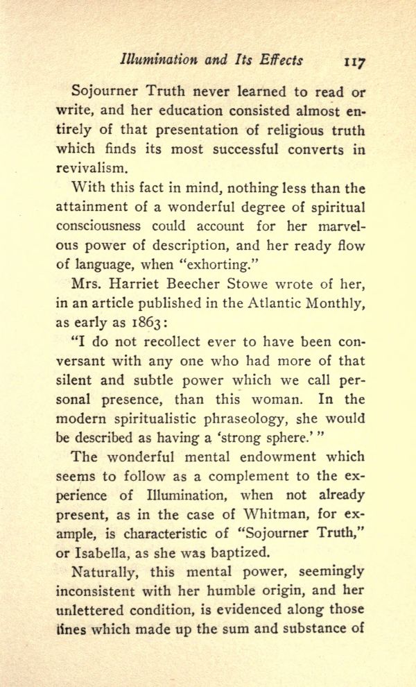 The wonderful mental endowment which seems to follow as a complement to the experience of Illumination, when not already present, as in the case of Whitman, for example, is characteristic of "Sojourner Truth," or Isabella, as she was baptized.