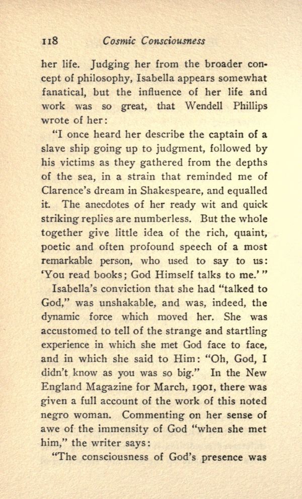 Isabella's conviction that she had "talked to God," was unshakable, and was, indeed, the dynamic force which moved her. She was accustomed to tell of the strange and startling experience in which she met God face to face, and in which she said to Him: "Oh, God, I didn't know as you was so big." In the New England Magazine for March, 1901, there was given a full account of the work of this noted negro woman. Commenting on her sense of awe of the immensity of God "when she met him," the writer says: