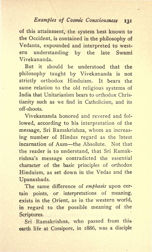 Vivekananda honored and revered and followed, according to his interpretation of the message, Sri Ramakrishna, whom an increasing number of Hindus regard as the latest incarnation of Aum--the Absolute. Not that the reader is to understand, that Sri Ramakrishna's message contradicted the essential character of the basic principles of orthodox Hinduism, as set down in the Vedas and the Upanashads.