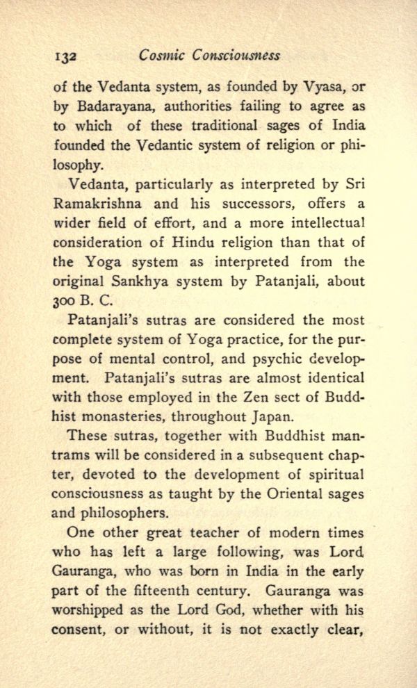 Vedanta, particularly as interpreted by Sri Ramakrishna and his successors, offers a wider field of effort, and a more intellectual consideration of Hindu religion than that of the Yoga system as interpreted from the original Sankhya system by Patanjali, about 300 B.C.
